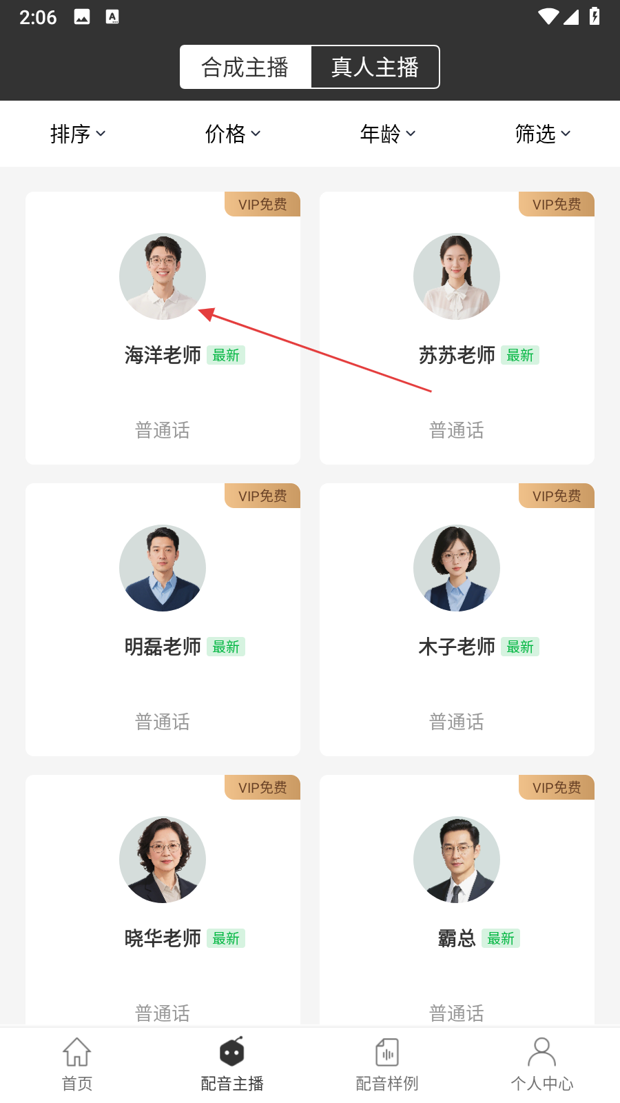 1、打開訊飛配音應(yīng)用,點擊底部配音主播選項進(jìn)入主播列表,切換合成主播或真人主播標(biāo)簽,選擇目標(biāo)主播。