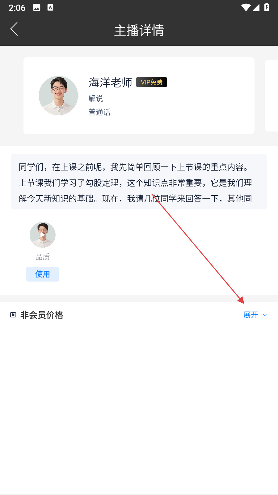 2、進(jìn)入主播詳情頁,找到非會員價格欄,點擊右側(cè)展開按鈕。