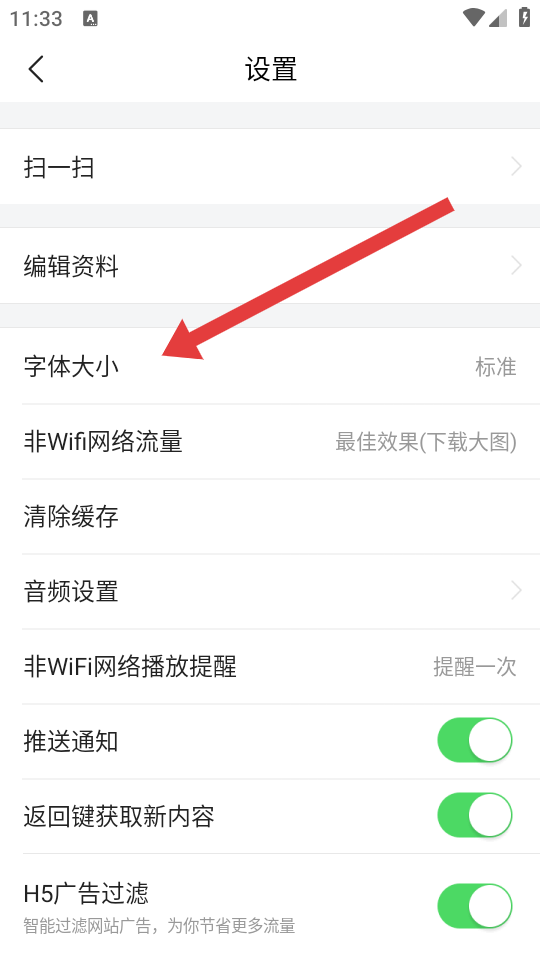 2、在設(shè)置頁面,點(diǎn)擊字體大小的選項,進(jìn)入字體大小預(yù)覽界面。