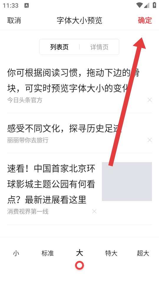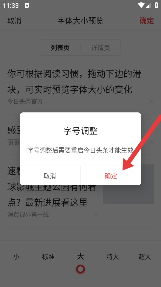 4、在彈出的字號調(diào)整確認(rèn)框中,點(diǎn)擊確定的按鈕,重啟今日頭條后字體大小設(shè)置生效。