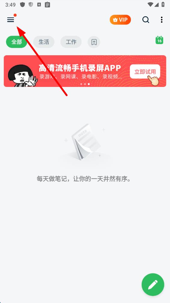 1、打開備忘錄隨手記app,點擊界面左上角的三條橫線圖標,打開側(cè)邊欄菜單。