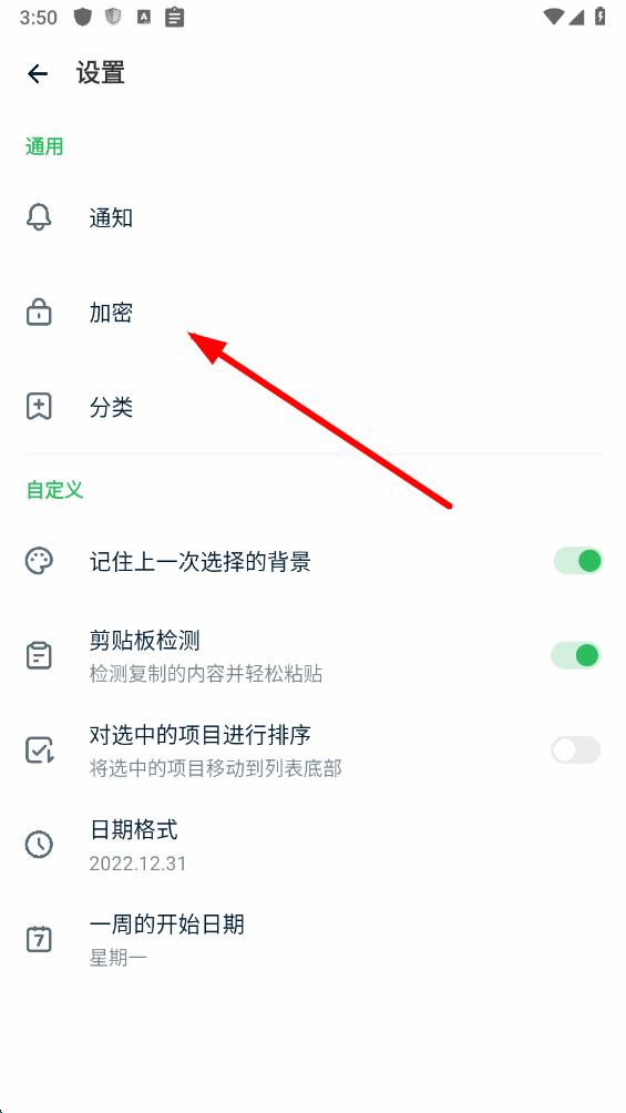 3、在設置頁面里,點擊加密選項,進入加密設置界面,以管理應用的安全防護功能。