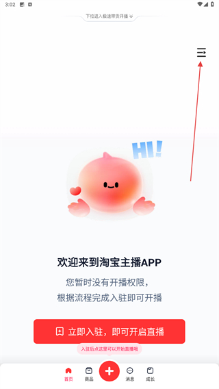 1、打開淘寶直播的應(yīng)用,進(jìn)入時(shí)點(diǎn)擊右上的功能圖標(biāo)。