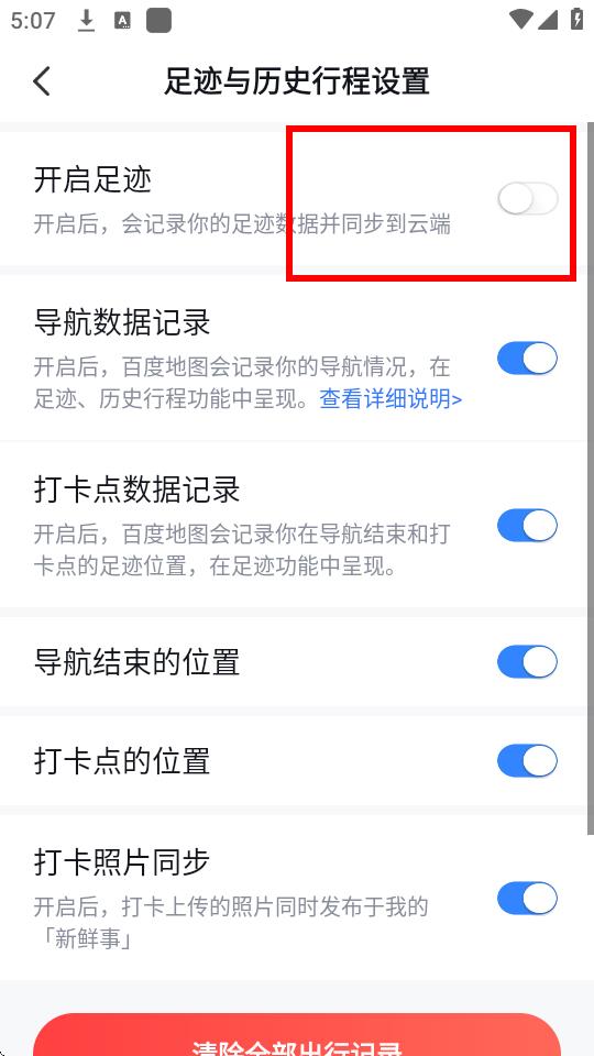 4、在足跡設(shè)置頁面,開啟記錄足跡等相關(guān)出行記錄功能選項(xiàng)即可。