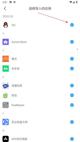 2、在應(yīng)用列表里找到需要隱藏或雙開的應(yīng)用,點(diǎn)擊應(yīng)用右側(cè)的加號(hào)圖標(biāo)。