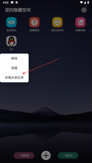 3、返回隱藏空間主界面,長(zhǎng)按已導(dǎo)入的應(yīng)用圖標(biāo),在彈出的菜單中選擇刪除外部應(yīng)用,該應(yīng)用就會(huì)從手機(jī)主桌面隱藏。