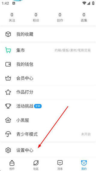 2、在我的頁面中,找到并點擊下方的設置中心選項。
