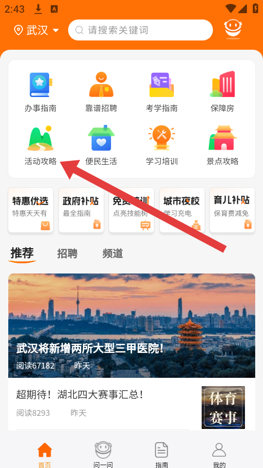 1、打開武漢本地寶,在首頁(yè)點(diǎn)擊活動(dòng)攻略圖標(biāo),進(jìn)入活動(dòng)專題頁(yè)面,開啟演唱會(huì)信息查詢流程。