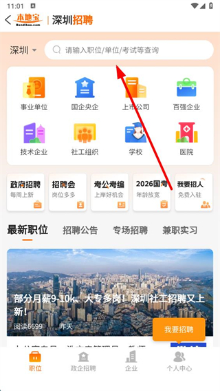 4、填寫完成后,可在招聘頁(yè)面的搜索框輸入查詢,也可瀏覽各類企業(yè)分類及最新職位信息找工作。
