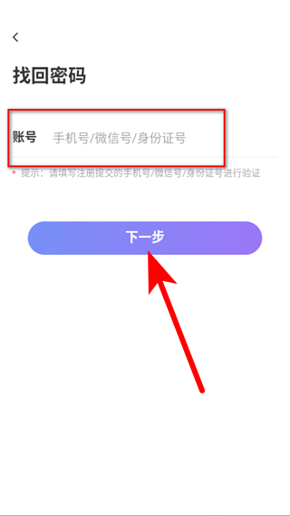3、在找回密碼頁(yè)面,輸入賬號(hào)手機(jī)號(hào)/微信號(hào)/身份證號(hào)后,點(diǎn)擊下一步。
