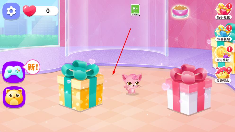 3、喂養(yǎng)后萌寵成長,點擊場景中的禮盒,獲取對應的游戲道具獎勵。