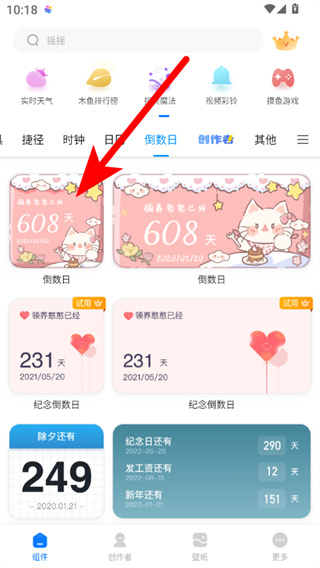 1、在萬(wàn)能小組件組件頁(yè)面,點(diǎn)擊倒數(shù)日選項(xiàng),進(jìn)入倒數(shù)日組件列表頁(yè)面。