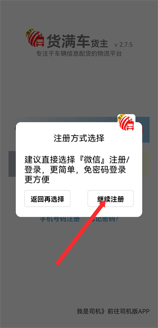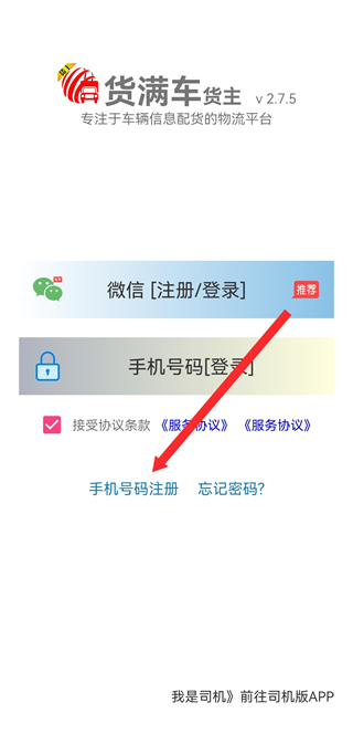 1、打開貨滿車,點擊手機號碼注冊,進入注冊方式選擇界面。