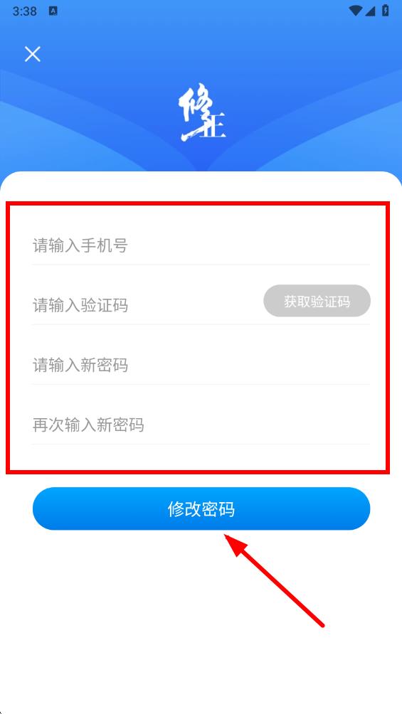 4、在修改密碼頁面,依次輸入手機號、驗證碼、密碼,最后點擊修改密碼,即可完成密碼修改。