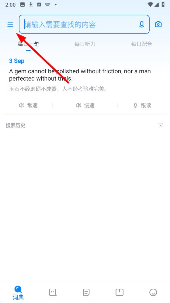 1、打開歐路詞典app在首頁點擊左上角的三條橫線圖標打開側(cè)邊欄菜單。