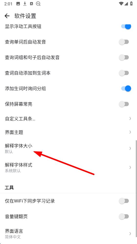 3、在軟件設置界面中下滑找到解釋字體大小選項,點擊后根據(jù)個人需求選擇合適的字體大小,即可完成歐路詞典字體大小的設置。