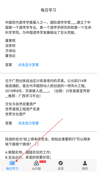 1、點擊底部每日學習,可瀏覽各類知識題目,涉及各種各樣的題目,點擊點擊顯示答案能查看對應(yīng)題目答案。
