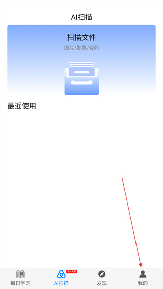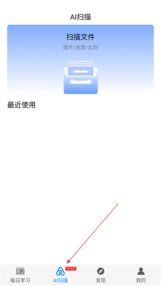 2、點擊底部AI掃描,進入AI掃描頁面,可對圖片、發(fā)票、合同等進行掃描文件操作,也能查看最近使用的掃描記錄。