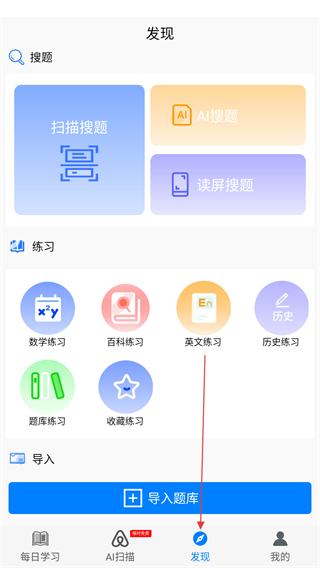 3、點擊底部發(fā)現(xiàn),進入發(fā)現(xiàn)頁面,可使用各個功能,還能在練習板塊選擇不同學科練習,也可點擊導(dǎo)入題庫導(dǎo)入相關(guān)題庫。