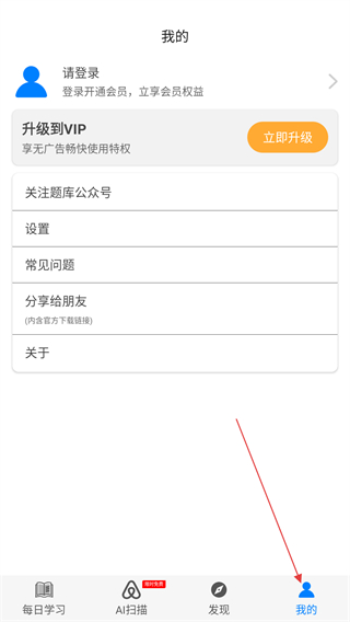 4、點擊底部我的,進入個人中心頁面,可進行登錄,能關(guān)注題庫公眾號、進入設(shè)置、查看常見問題、分享給朋友及了解軟件相關(guān)信息。