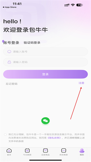 1、打開包牛牛APP,進(jìn)入時點擊下方登錄/注冊的按鈕。