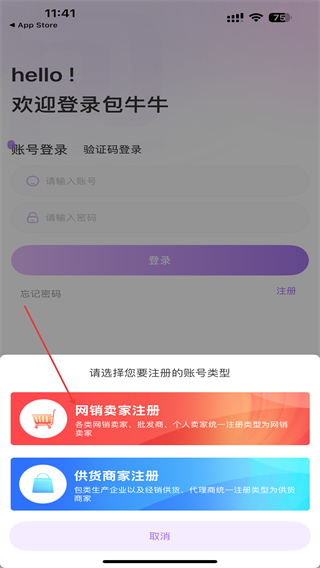 3、在下方彈出的信息中,點擊網(wǎng)銷賣家注冊的按鈕。