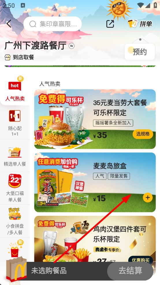 1、打開麥當勞APP,進入餐廳點餐界面,選擇想要購買的餐品,點擊右側(cè)的+號,添加至購物車。