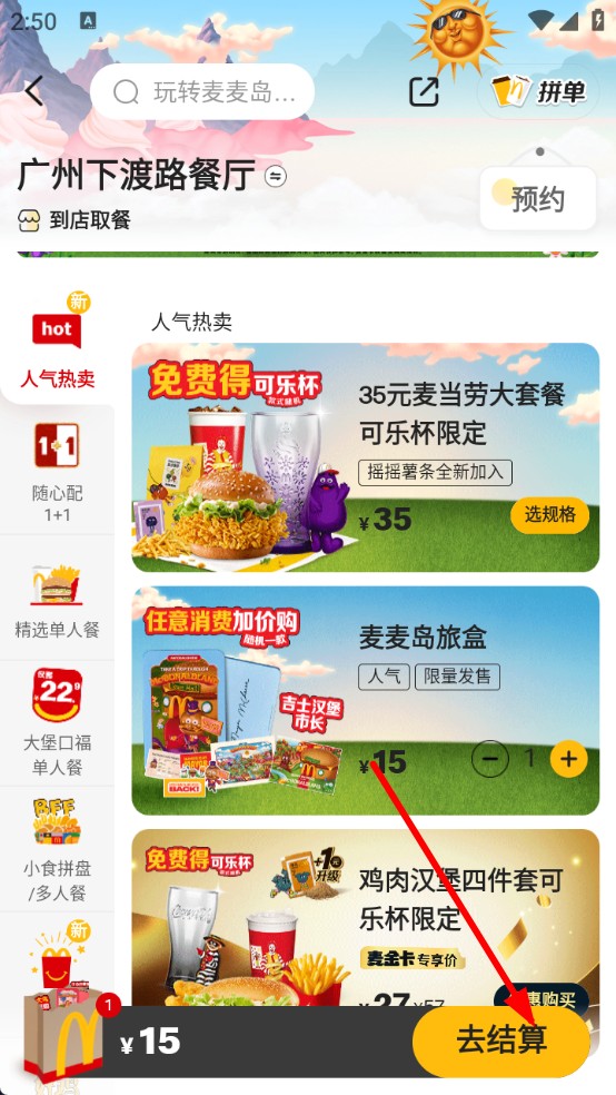 2、確認所選餐品后,點擊頁面下方的去結(jié)算按鈕。