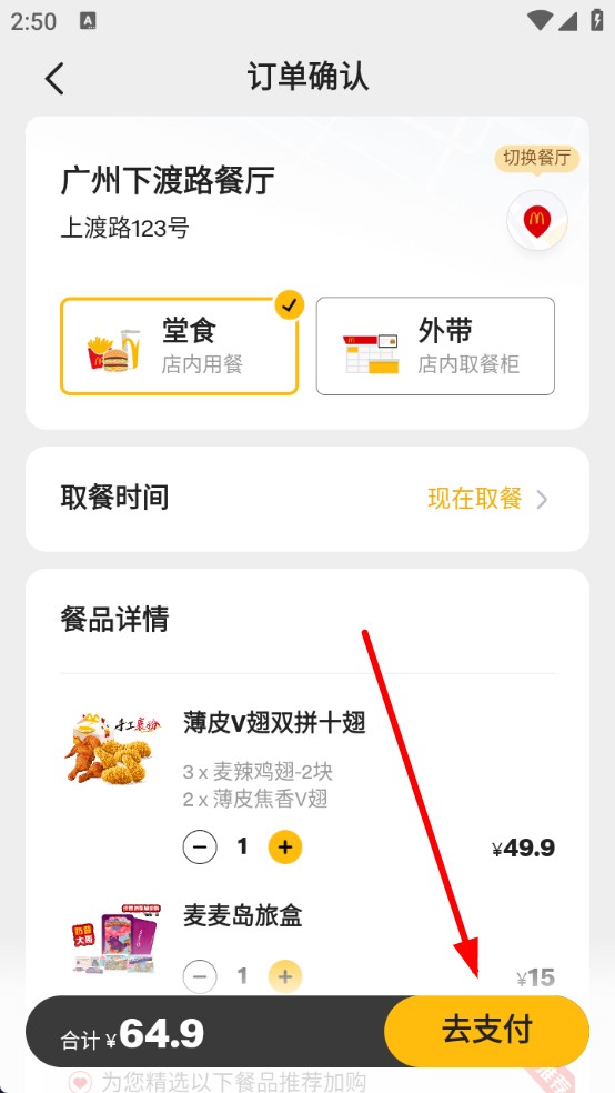 3、在訂單確認頁面,點擊去支付按鈕,完成支付后即完成點餐。