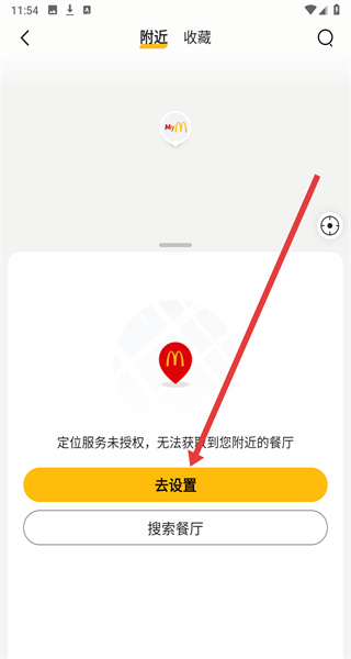 2、若定位服務(wù)未授權(quán),點擊去設(shè)置按鈕進行授權(quán),授權(quán)后即可查看附近的麥當勞餐廳列表。