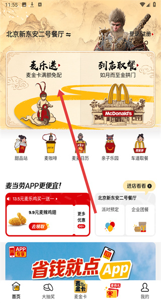 4、成功選定北京新東安二號餐廳后,可在頁面中選擇麥樂送或到店取餐等服務(wù),開展點餐等后續(xù)操作。