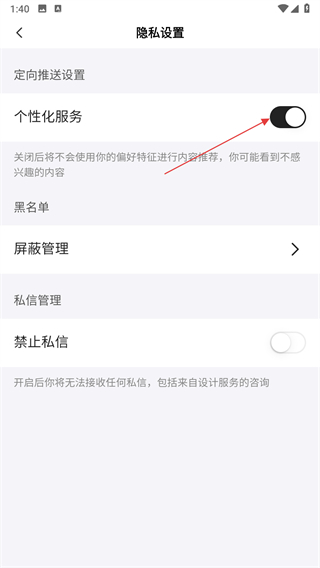 4、在隱私設(shè)置頁面中,找到個性化服務(wù)選項,點擊其對應(yīng)的開關(guān)按鈕,將個性化服務(wù)關(guān)閉。