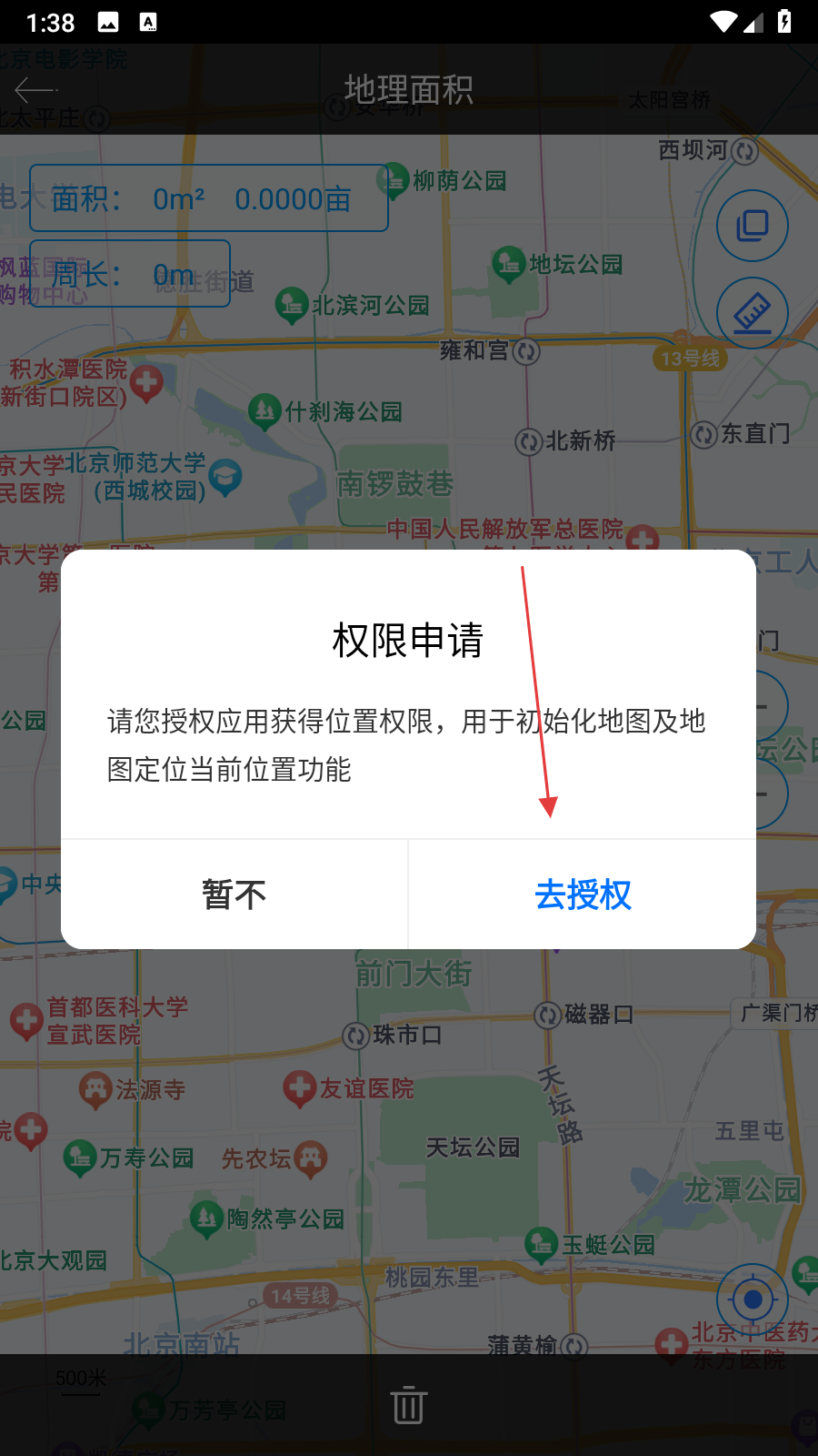 2、進(jìn)入界面后,若彈出權(quán)限申請?zhí)崾究?,點(diǎn)擊去授權(quán)按鈕,授予應(yīng)用位置權(quán)限。