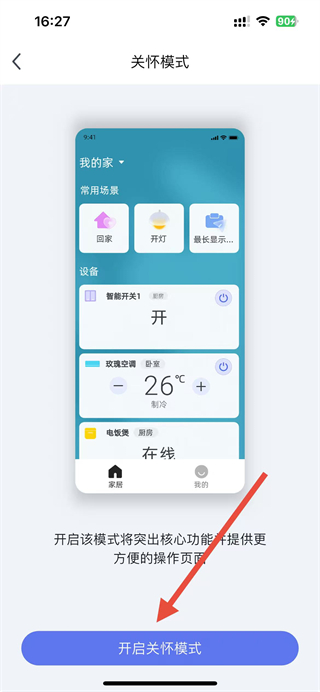 4、在關(guān)懷模式設(shè)置頁(yè)面,點(diǎn)擊開(kāi)啟關(guān)懷模式按鈕,即可開(kāi)啟關(guān)懷模式。