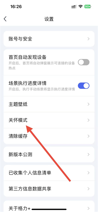 3、在設(shè)置頁(yè)面,點(diǎn)擊關(guān)懷模式選項(xiàng),進(jìn)入關(guān)懷模式設(shè)置頁(yè)面。