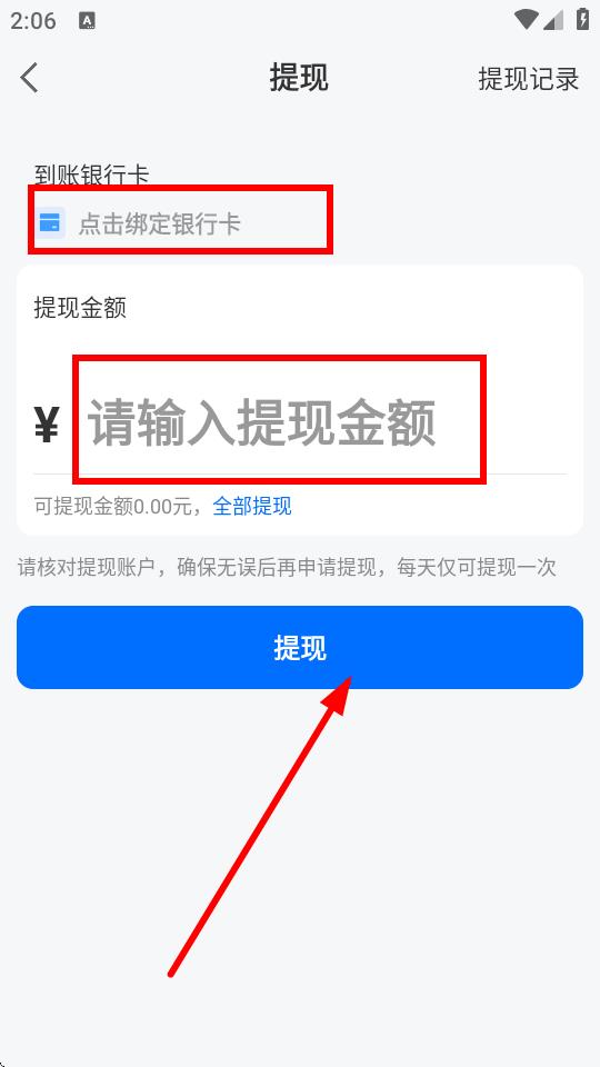 4、進入提現(xiàn)頁面后,先綁定銀行卡,然后在提現(xiàn)金額輸入框中輸入要提現(xiàn)的金額,再點擊提現(xiàn),按照提示完成后續(xù)操作即可。