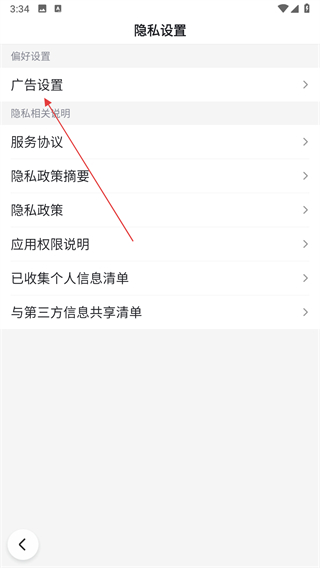3、進(jìn)入隱私設(shè)置頁(yè)面后,點(diǎn)擊廣告設(shè)置選項(xiàng)。