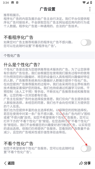 4、在廣告設(shè)置頁(yè)面,點(diǎn)擊不看個(gè)性化廣告的開關(guān)。