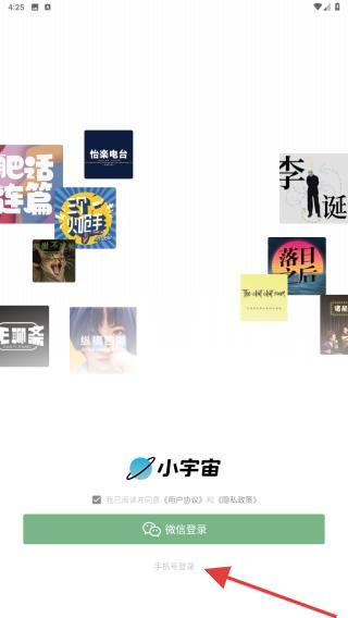 1、打開(kāi)小宇宙APP,進(jìn)入到首頁(yè)內(nèi),點(diǎn)擊手機(jī)號(hào)登錄的按鈕。
