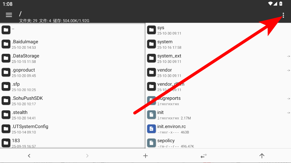 1、在文件管理界面,點(diǎn)擊右上角三點(diǎn)按鈕,展開(kāi)功能菜單。