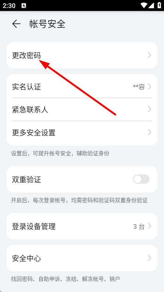 4、進(jìn)入帳號(hào)安全頁(yè)面后,點(diǎn)擊更改密碼,按照后續(xù)提示完成密碼修改操作。