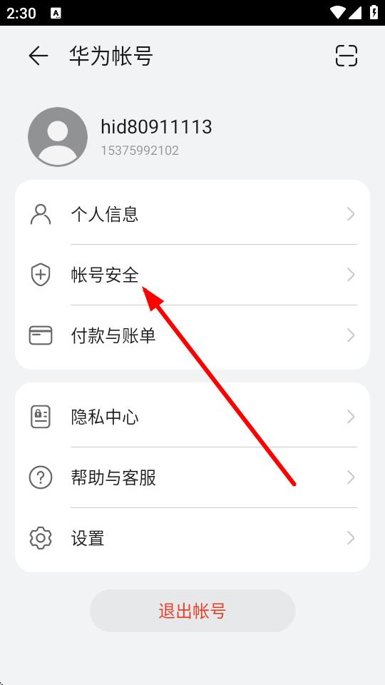 3、在華為帳號(hào)頁(yè)面里,點(diǎn)擊帳號(hào)安全選項(xiàng)。
