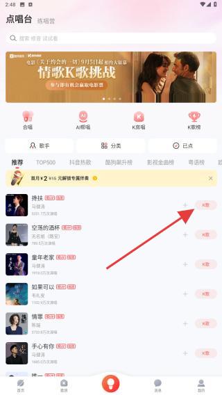 2、在歌曲列表中搜索/選擇想演唱的歌曲,點(diǎn)擊歌曲右側(cè)k歌的按鈕。