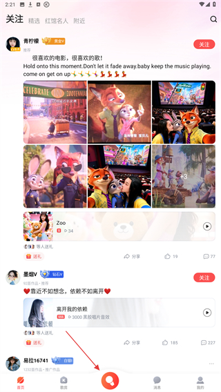 1、啟動(dòng)酷狗唱唱的應(yīng)用,在首頁(yè)下方點(diǎn)擊麥克風(fēng)的按鈕。