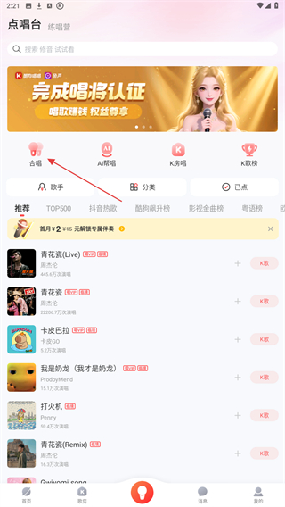 2、進(jìn)入點(diǎn)唱臺(tái)的頁(yè)面內(nèi),點(diǎn)擊合唱的功能按鈕。