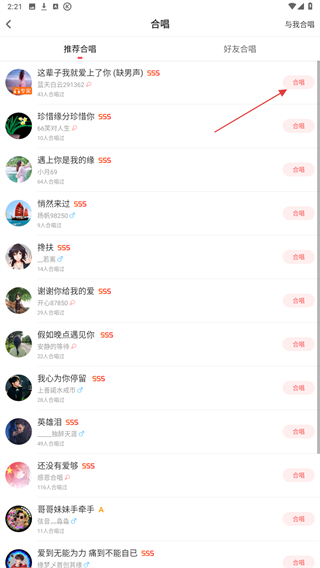 3、在合唱的頁(yè)面內(nèi),選擇歌曲并點(diǎn)擊右側(cè)合唱的按鈕。