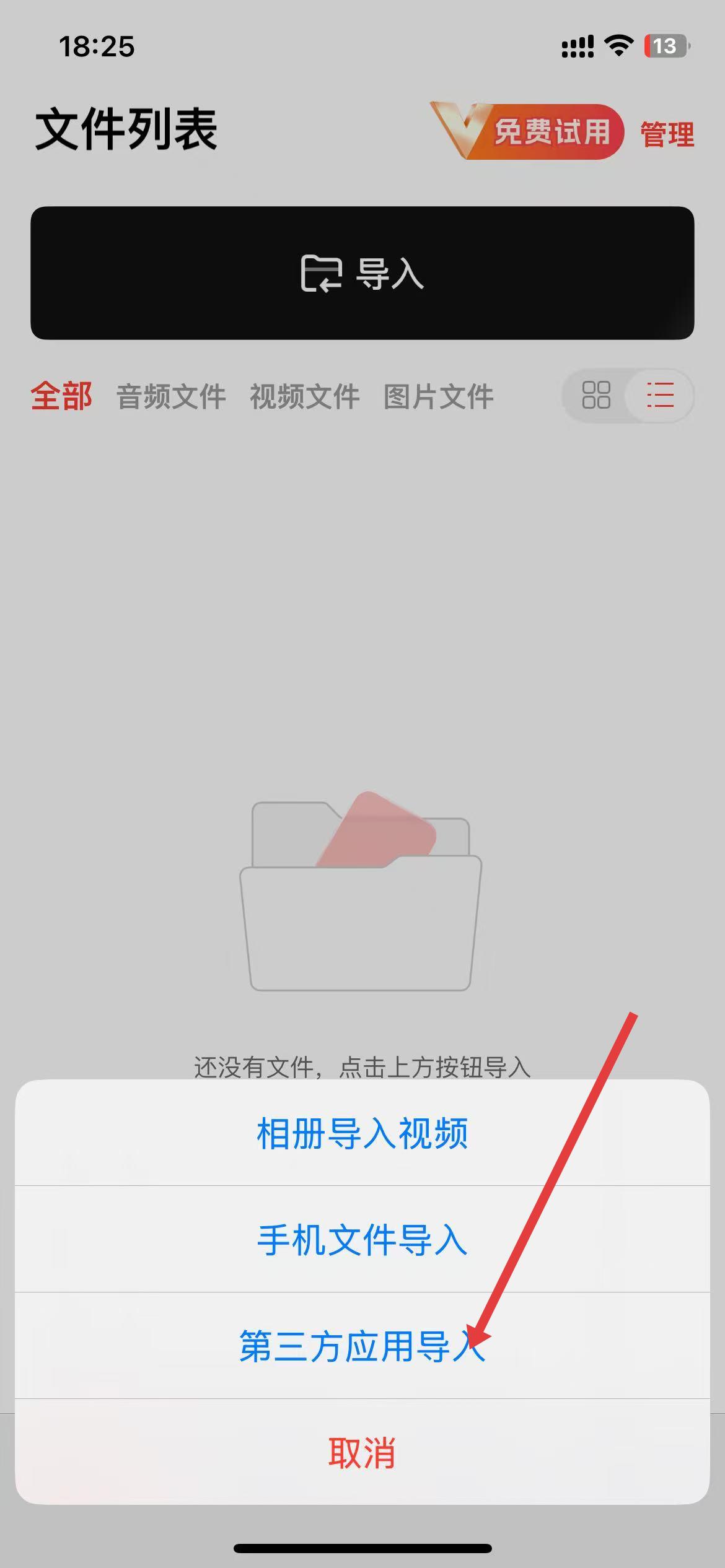 2、點(diǎn)擊后會(huì)彈出導(dǎo)入方式選擇菜單,選擇第三方應(yīng)用導(dǎo)入方式。