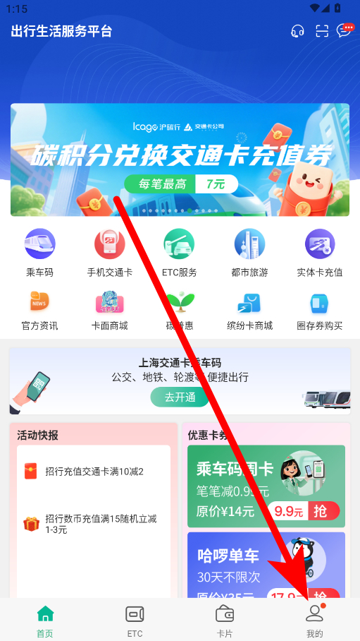 1、在出行生活服務(wù)平臺首頁,點(diǎn)擊右下角我的,進(jìn)入個(gè)人頁面。