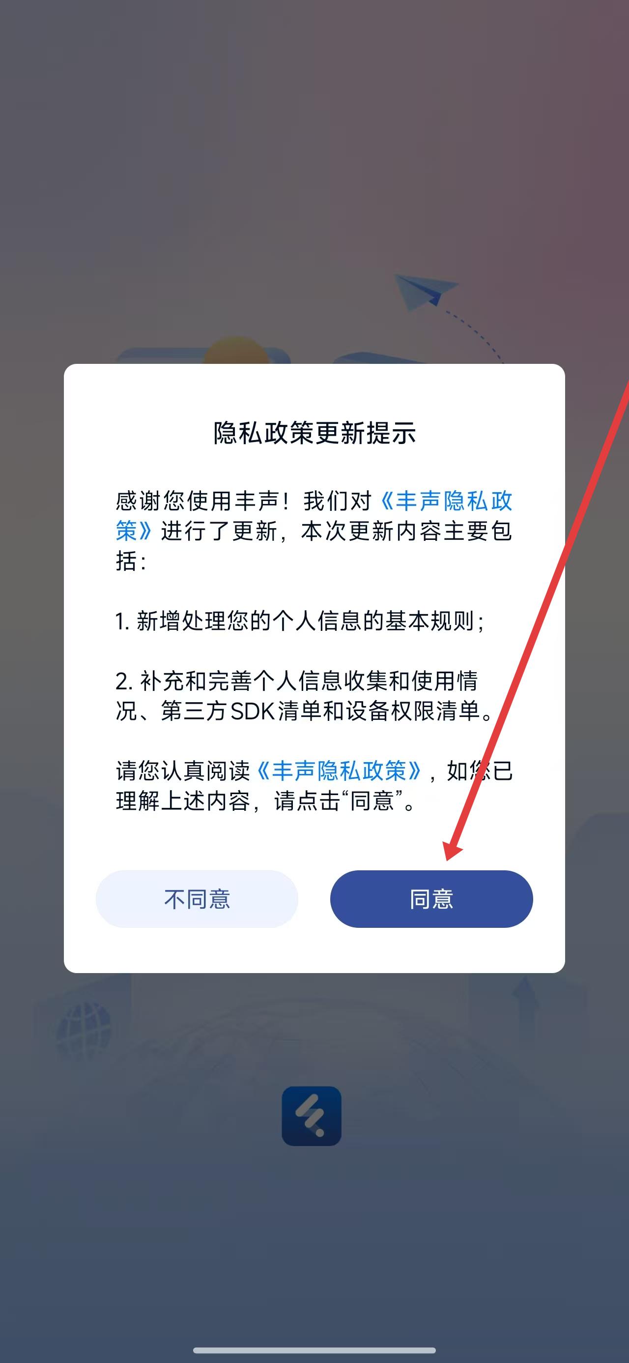 1、打開豐聲app后,點(diǎn)擊彈窗中的同意按鈕進(jìn)入使用。