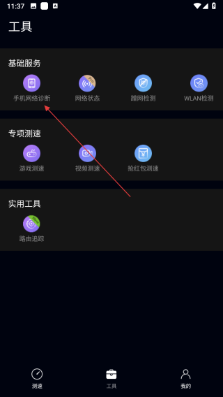 2、在工具頁面的基礎(chǔ)服務(wù)區(qū)域,點(diǎn)擊手機(jī)網(wǎng)絡(luò)診斷選項,應(yīng)用開始診斷手機(jī)網(wǎng)絡(luò)。